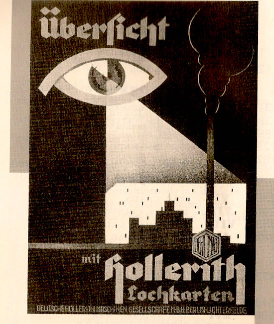 So what’s going on? Well, right now I'm working my way through a section of Surveillance Valley that deals with the history of computers and the Internet. I don’t want to give away too many spoilers, but one thing I keep being amazed at is just how tightly mass surveillance and war has been intertwined with the development of computers — going all back more than a century. Everyone focuses on cryptography, but it goes way deeper than that. Just check out this early 1930's poster for an IBM German subsidiary that sold Hollerith machines — punch card tabulator-computers invented more than 100 years ago: "See everything with Hollerith punch cards.”