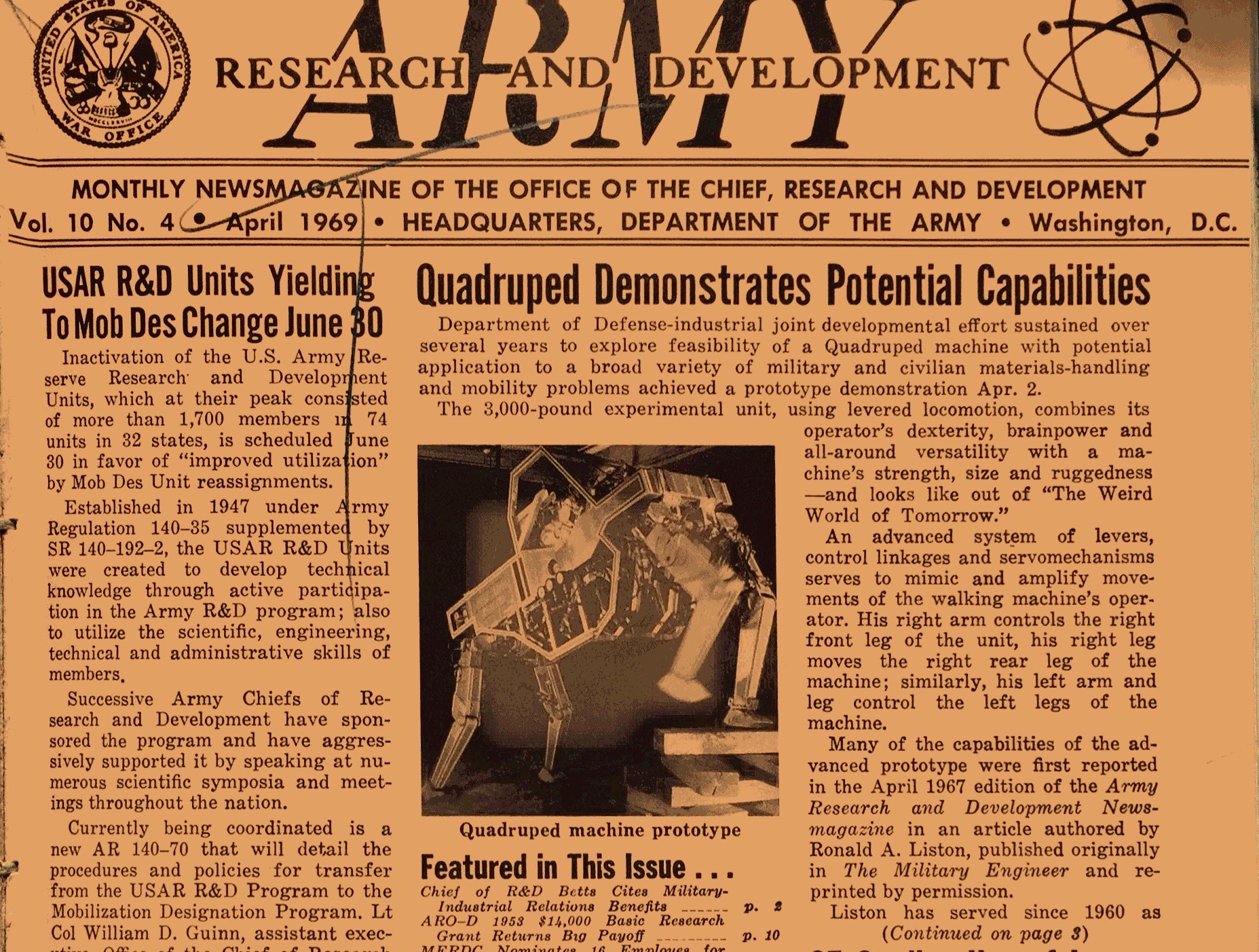 Interesting side note: a few years later, in the mid-70s, Army R&D would be renamed Army RD&A — the "a" is for acquisition. Not surprisingly, the mag slowly morphed from just a straight up info bulletin on army research into a kind of "Men's Health" for military procurement nerds — a sales catalogue with fancy full color covers and picture spreads that drummed up fears of Soviet military might and showcased overpriced (and mostly useless and rarely used) military toys.