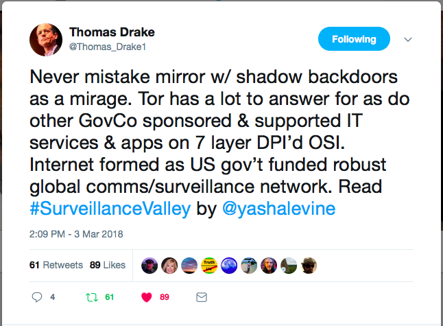 This endorsement is the highest honor—coming from a courageous NSA whistleblower and career signals intelligence officer who knows and understands the corrupt innards of our high-tech surveillance state better than just about anyone. It's great to see that he shares my critical view of USG-funded privacy tools like Tor and Signal.